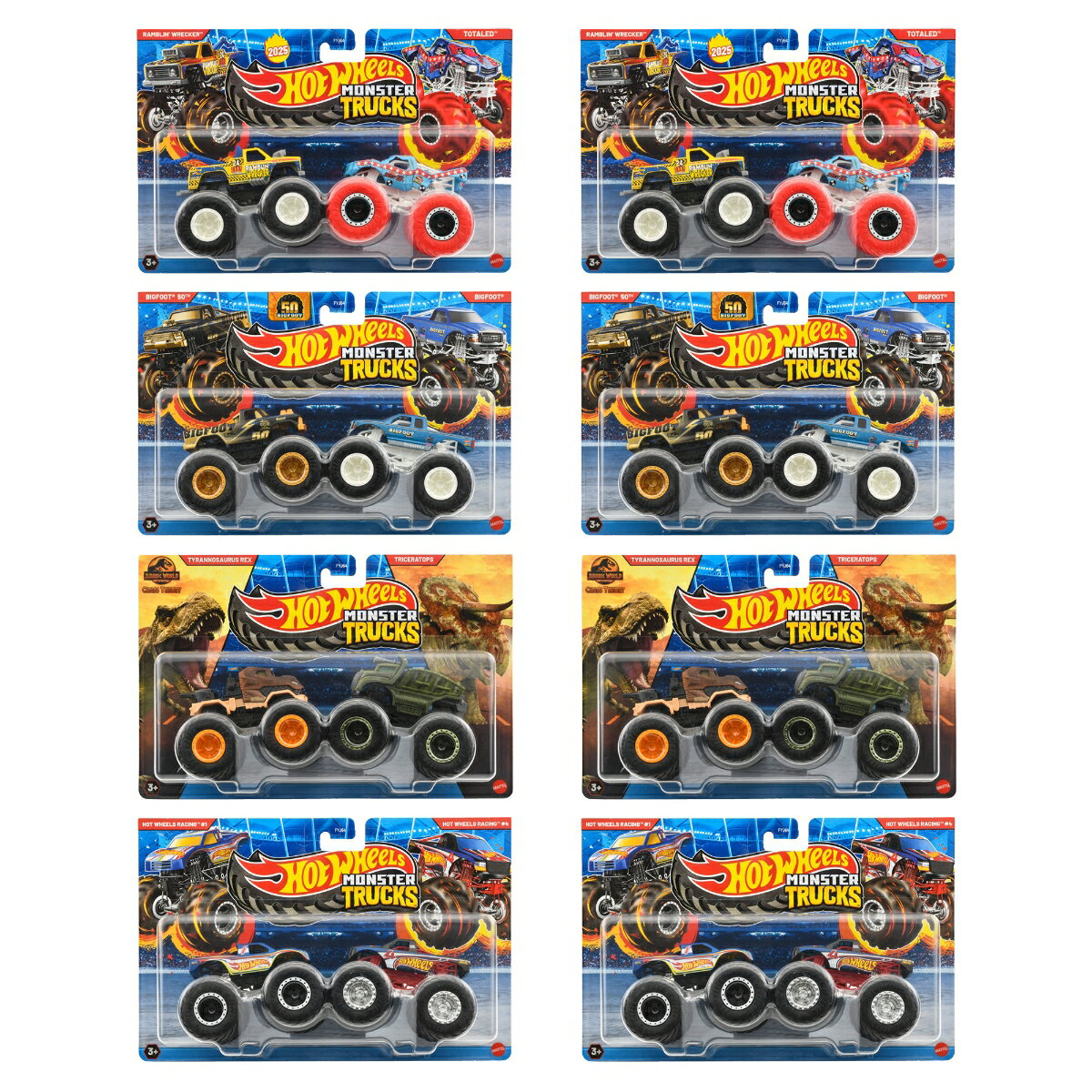 【内容】各テーマ別に、モンスタートラックが2台セットになって登場!今回のアソートでは、「ランブリン・レッカー」、「ビッグフット(50周年)」が新しいデコになって登場!全4種類がラインアップ!【内訳】ランブリン・レッカー/トートル (Wrecked (Ramblin' Wrecker™ / Totaled™))x2、ビッグフット(50周年)/ビッグフット(Bigfoot's 50th Anniversary (Bigfoot® 50th / Bigfoot®))x2、T-レックス/トリケラトプス(Jurassic 2-Pack (Tyrannosaurus Rex / Triceratops))x2、レーシング#1/レーシング#4(HW Racing (Hot Wheels Racing™ #1 / Hot Wheels Racing™ #4))x2、合計8点【原産国】タイ 【対象年齢】3歳〜【BOX入り】BOX販売のため、専用の段ボールに入っています。専用段ボールは商品がピッタリ収まるため、大切なコレクションを保管するのに最適です。【Brandについて】カリフォルニア生まれ 1秒間に16台売れているミニカー。【ホットウィール】Hot Wheels=「かっこいい車!」独特な南カルフォルニア風の外観、高速に動くホイール、(当時の最新技術!)そして 赤いラインの入ったタイヤ。現在、世界で一番売れているミニカーです*。*Circana/Retail Tracking Service/G12/JAN-DEC 2023/Total Toys/Projected Units【プレゼントに最適】お誕生日、クリスマスプレゼント、入園・入学祝いなど記念日でのプレゼントにぴったりです。【対象年齢】:3歳以上【商品サイズ (cm)】(幅×高さ×奥行):25.4×16.5×6.4
