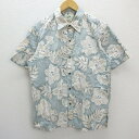 ★ハワイ製 パームウェーブ/PALMWAVE HAWAII ハワイアイン柄 半袖コットンアロハシャツ【M】青MENS/34【中古】