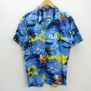 ★ハワイ製 パームウェーブ/PALMWAVE HAWAII ハワイアイン柄 半袖コットンアロハシャツ【M】青MENS/34【中古】