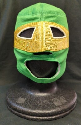 プロレスマスク ブシオ製【ミル・マスカラス ハーフタイプ(黒ラメ・銀ラメ×銀・金特殊生地・赤・黒・薄緑・黄フチ)】 公認タグ付き サイン入り 手に持った写真付き