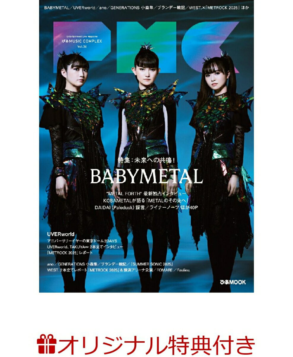 『ぴあMUSIC COMPEX(PMC)Vol.36』表紙・BABYMETAL世界最速インタビュー&KOBAMETALバックカバー・UVERworld & TAKUYA∞ 2本立てインタビューWEST.「METROCK 2025」&横浜アリーナ 2本立てライブレポano、GENERATIONS小森隼らインタビューもBABYMETALが表紙を飾る『ぴあMUSIC COMPLEX (PMC) Vol.36』が発売。表紙・巻頭特集はBABYMETAL。結成15周年を迎え、史上最大規模のワールドツアーへ向かう中、メンバーはもちろんプロデューサーKOBAMETALに、待望の4thアルバム『METAL FORTH』(8.8発売)について、世界最速でロングインタビューを敢行。収録曲「KxAxWxAxIxI」の作曲編曲を務めるDAIDAI(Paledusk)の証言インタビューも含め、新たなメタルシーンを担う次世代アーティストの共鳴をお届けします。海外からも多数応募があった読者アンケートの結果にもご期待ください。バックカバーで登場するUVERworldには、結成25周年&デビュー20周年のアニバーサリーイヤーに際しての6人のバンドインタビューと、ニューアルバム『EPIPHANY』(7.2発売)に向けてのTAKUYA∞ソロインタビューの2本立て取材を実施、「METROCK 2025」のライブレポートも掲載し、東京ドーム2DAYSに挑む彼らの熱量を伝えます。今号のライブレポートはWEST.。「METROCK 2025」GREEN FORESTにて念願のトリを務めることになった、同フェスのレポートに加え、9都市28公演に及ぶアリーナツアー「WEST. LIVE TOUR 2025 A.H.O. -Audio Hang Out-」より5月2日神奈川・横浜アリーナのレポートという2本立てで12ページにわたって掲載します(※横浜アリーナのレポートはぴあアプリ&WEBに掲載中。本誌誌面には未掲載写真を掲載)。そのほか、撮り下ろし&インタビューとしては、マルチに大活躍の“あのちゃん”に、アーティストanoとしてリリースした2ndアルバム『BONE BORN BOMB』をはじめとする音楽活動について。GENERATIONSからはメンバープロデュース楽曲配信プロジェクト「PRODUCE 6IX COLORS」第4弾「MY GENERATION」を担当する小森隼が登場。ASIAN KUNG-FU GENERATION・後藤正文に依頼した制作秘話についてインタビュー、10Qでは小森自身を深掘りしました。また、メジャーデビュー1stアルバム『BRANDY SENKI』をリリースする話題の3ピースバンド、ブランデー戦記には、そのクリエイティブについて聞きました。ほかにも、結成10年目を迎え、ライブシーンを基軸に活動の幅を広げるFOMARE、実力派ガールズバンド、Faulieu.らの、未来のシーンにつながる特集をお届けします。【コンテンツ】特集:未来への共鳴!◎BABYMETAL混迷する時代に輝ける傑作。『METAL FORTH』が描く未来KOBAMETALが語る「メタルのその先へ」4thアルバム『METAL FORTH』全曲紹介DAIDAI(Predusk)の証言/読者アンケート◎UVERworldUVERworldが巻き起こす共鳴。アニバーサリーイヤーの東京ドームInterview with UVERworld/Interview with TAKUYA∞Live Report “METROCK 2025”◎ano心の波動を起こすanoの破壊と愛の表現◎GENERATIONS小森隼“ジェネ”小森隼プロデュースは“アジカン”後藤正文作詞作曲◎ブランデー戦記驚異的なスピードで駆け上がる新世代バンド!◎SUMMER SONIC 2025/SONICMANIA国内外の音楽シーンを表す、注目のステージは?◎WEST.דMETROCK 2025”WEST.がトリのステージを経て、主催フェスという新たな夢へ向かう!Live Report “METROCK 2025”/“WEST. LIVE TOUR 2025 A.H.O. -Audio Hang Out-”◎PICK UP! NEW MUSIC こっちのけんと/Benson Boone◎PIA SPECIAL PICK UP! FOMAREインタビュー/Faulieu.インタビュー◎Chim↑Pom from Smappa Group 「エリイの国の人」■ BABYMETAL表紙ビジュアル 綴じ込みポスター(A3変形二つ折り)付き