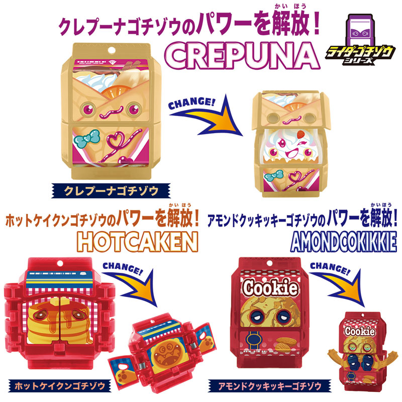 クレプーナゴチゾウ、ホットケイクンゴチゾウ、アモンドクッキッキーゴチゾウ、3体のゴチゾウがセットになったアイテムです。
