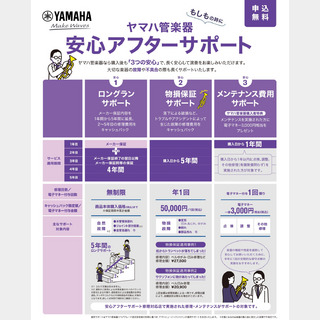 新品のヤマハ管楽器をご購入いただくと、「安心アフタ―サポート」に無料でご加入いただけます。