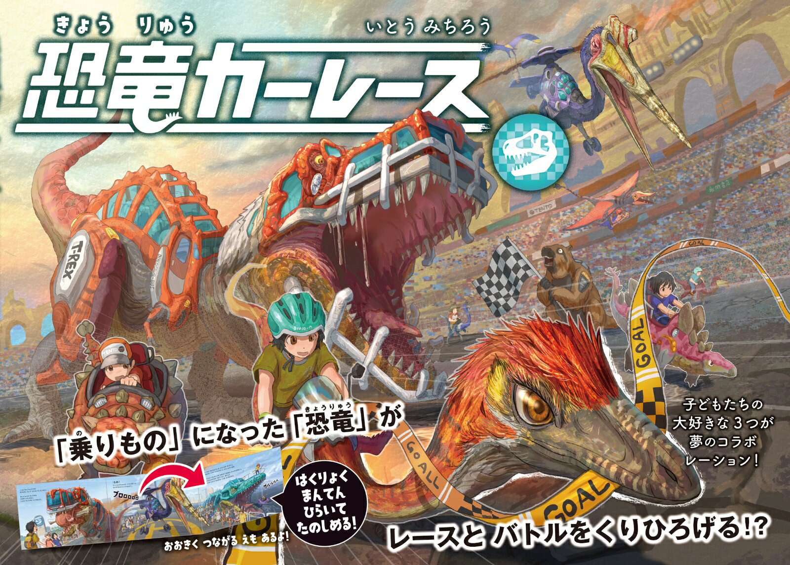 恐竜や古生物が乗り物となって働く世界で開催される「恐竜カーレース」。力自慢、スピード自慢の乗り物たちが、陸上、水中、空中で迫力満点のレースを展開します。パワーバトルに参戦するのはティラノサウルスバスやマンモス除雪車、スピードレースではガリミムス宅配バイクやオルニトミムスの郵便バイクが大活躍。水中レースにはモササウルスジェット船にメガロドンのスピードボートも参戦して大荒れの予感……!最後はケツァルコアトルスハングライダーやプテラノドンパラグライダーが大空を舞う空中レース。陸上、水中、空中をいきいきと駆け抜ける恐竜、古生物の乗り物たち。2倍に開くしかけで大迫力のレースを楽しめます。恐竜・古生物好き、乗り物好き、そしてレースやバトル好きの子どもたち大興奮の絵本です。