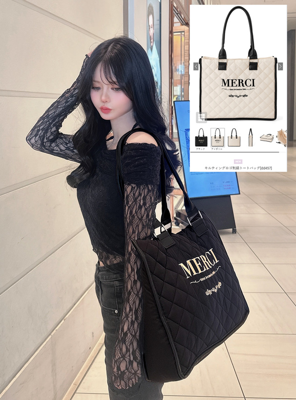 キルティングとフェイクレザーのコンビで、クラシカルに仕立てたトートバッグ。