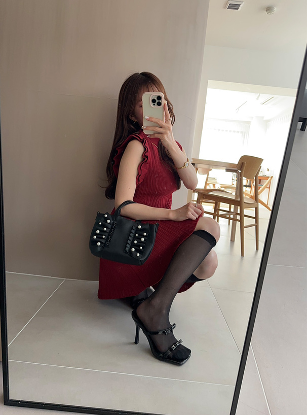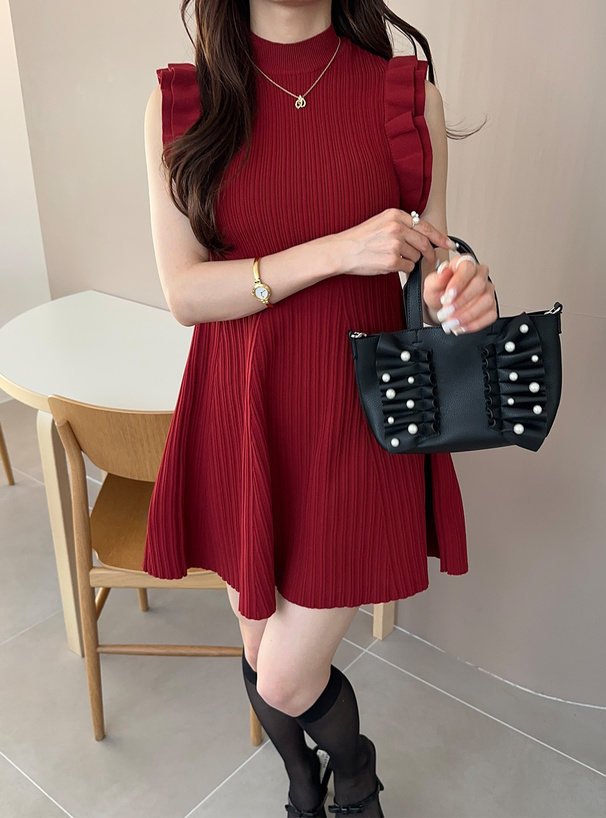 リボンのようにフロントにあしらった立体フリルと大ぶりパールが存在感たっぷりのバッグ。