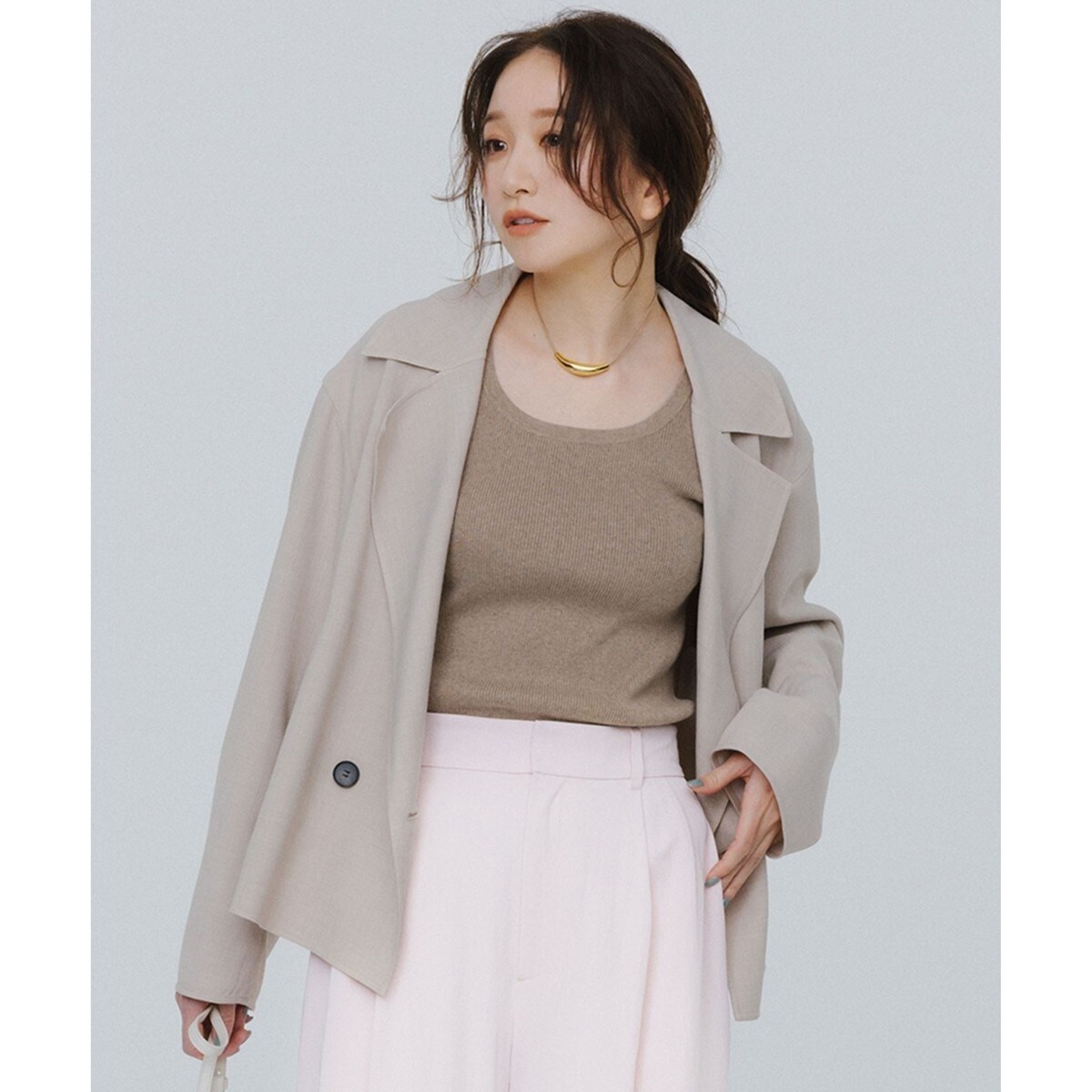 軽やかでふくらみのある素材感をいかしたショート丈のトレンチコート。ボタンの位置を少し低めに設定することでトレンド感のあるデザインです。前端などをリバー仕立てにする事で高級感のある仕上がりです。カラーは、明るく華やかな雰囲気のベージュ(#033)、爽やかで涼しげな印象のライトグレー(#003)の2色展開です。