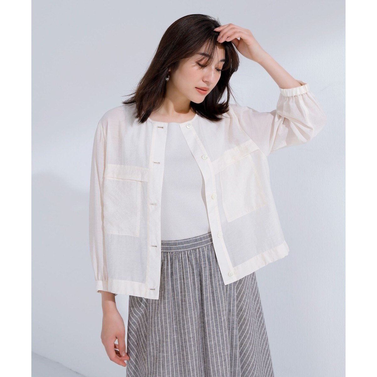 ■デザイントレンド感のある透け感と軽さが魅力のノーカラーブルゾン。前身頃のタック下の大きめのパッチポケットがデザインポイントです。ショートレングスの裾にはドローストリング付きで、絞ることでギャザーを寄せたシルエットにアレンジ可能。袖は8分袖で内側にゴムが入っているため、たくし上げても好みの位置でキープ出来ます。きれいめにもカジュアルにも馴染み、幅広いコーディネートが楽しめる一着です。裏なしです。