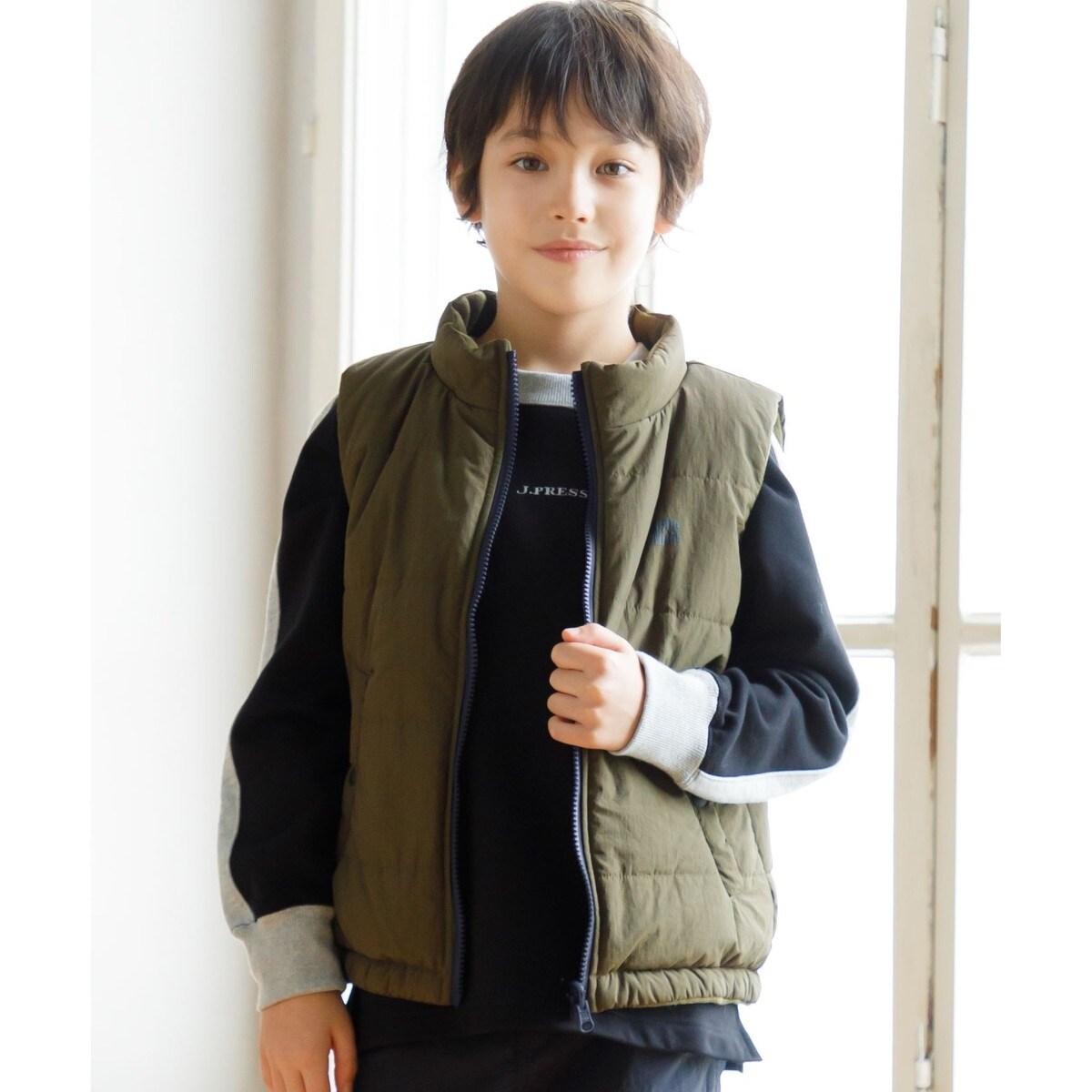 気温差のある不安定な気候に大活躍する、リバーシブルのベストです。表地はナイロンですっきりとした見え感、裏地は起毛仕様で表情がパッと変えられる、1枚で2着分のコーディネートが楽しめるアウターです。軽くて暖かいので、カットソーやシャツ、トレーナー、ニットなど、様々なトップスの上から羽織っていただきやすいアイテムです。胸元に施したJ.PRESSロゴ、ロゴ部分とファスナーの配色カラーがワンポイント。胸元はファスナー開きになっているので、お子様1人でも着脱しやすい仕様です。カジュアルコーデにも合わせていただきやすく、同素材のパンツ(PRJPCW0515)と合わせればスタイリッシュなセットアップコーデが楽しめます♪
