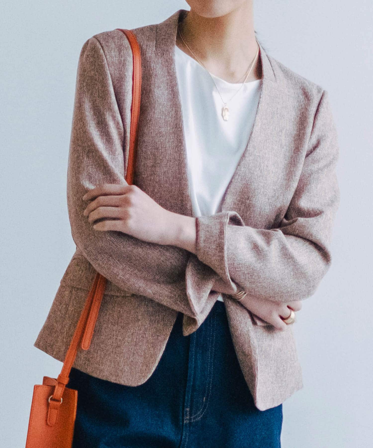 すっきりとシャープな印象に導くノーカラージャケット。簡単に折り返しが出来る袖スリットでほどよい抜け感を作ります。きちんと感のあるツイード素材だからオフィスコーデやお祝いのお式でもお使い頂けます!