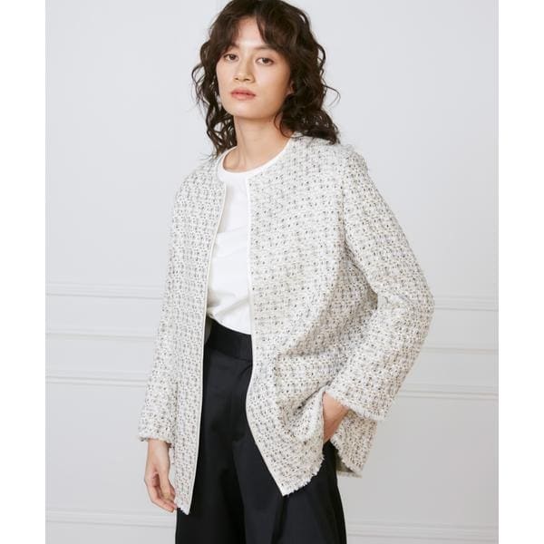 【2025春 セレモニー 卒園式 卒業式 入園式 入学式 フォーマル ハレの日】イギリスLINTON社のツイードを使用したジャケット。コットンのオーガンジーで裏打ちし、サテンでパイピングを施した清涼感あるノーカラージャケットに仕上げました。マスキュリンなシルエットですが、老舗ならではの上品なツイードが引き立つジャケットです。 ラメ糸が織り込まれたツイードは、華やかさとシックでモダンな印象を併せ持った表情が魅力です。《Linton Tweeds/リントン・ツイード》1912年創業のイギリスの老舗ファンシーツイードのファブリックメーカー。イギリス北西端に位置する自然豊かなカウンティ、カンブリア州の都市カーライルにあるリントン・ツイード社では、ファブリックのデザインから製織まで、ほぼ全ての工程が行われています。リントン・ツイード社は、ユニークで革新的な新しいデザインのファンシーヤーンを組み合わせて、女性用の高級ジャケットやスーツ、コートにふさわしい、エレガントで美しいカラーのファンシーツイード生地を織り上げています。・裏地あり■下げ札サイズ表記1=(S/7号)2=(M/9号)3=(L/11号)■サンプル撮影商品■こちらの商品はサンプルでの撮影となっております。実際の商品とは、サイズや色味、素材、デザイン等の仕様が若干変更になる場合がございます。