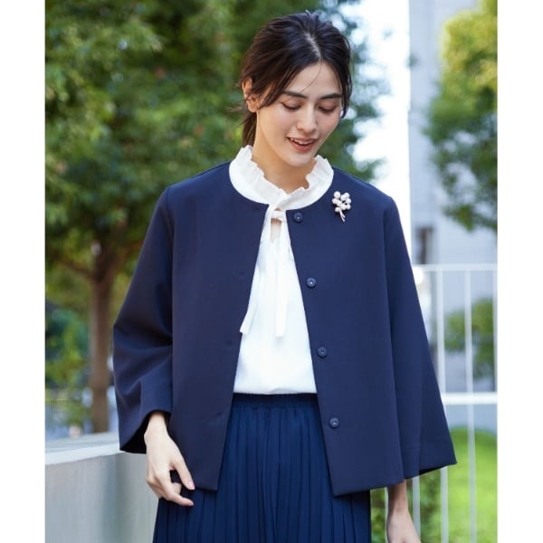 セットアップ可能なパンツ(F58-62001 F58-62002)にボウタイやフリルネックのブラウスとの相性が抜群なジャケットです。
