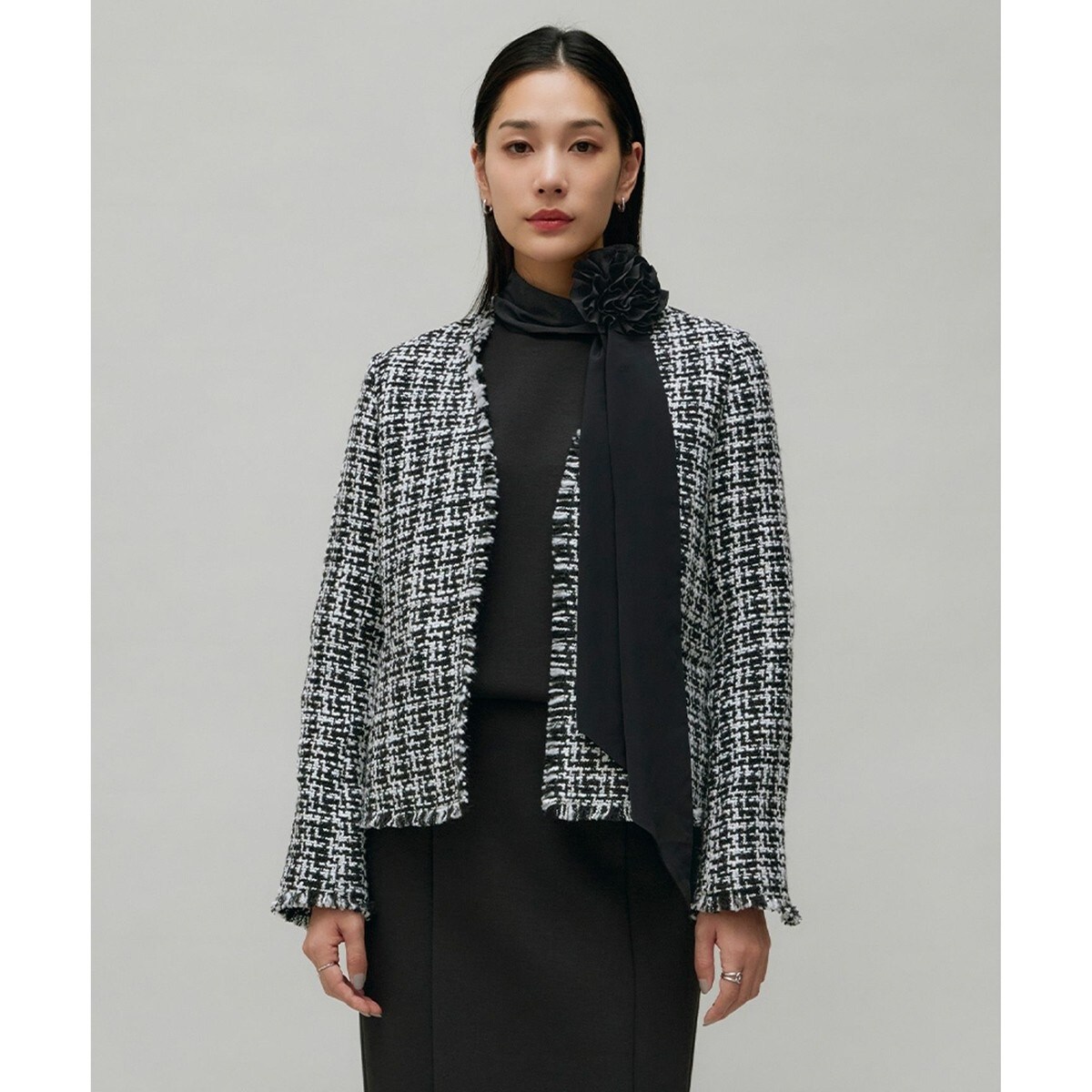 軽やかに羽織るツイードノーカラージャケット