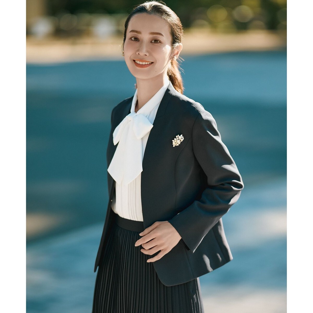 すっきりとしたVネックの、ホック留めタイプのノーカラージャケット。襟元を綺麗に見せるために立ち襟にし、身頃の切り替え部分下側には少しフレアーを入れることで女性らしさを演出。驚きの軽さを実現し、服の重みを感じさせにくくするため肩の部分に負担がかからないよう前肩の設計で縫製。肩パットを入れないことで、より軽く動きやすいアイテムが完成しました。同シリーズのスカートやパンツとのセットアップはもちろん、単品ジャケットとしても着ていただけます。背抜き仕様です。