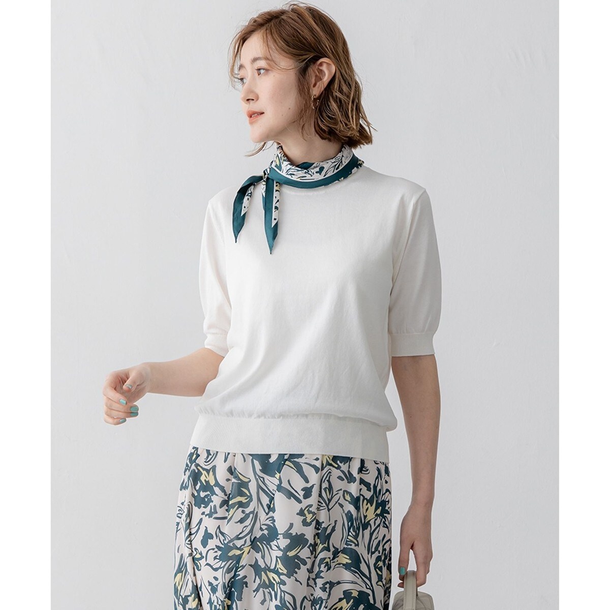 シンプルなモックネックのプルオーバーニット。気候に合わせて首もとをほど良くカバーします。袖丈を肘上にすることで、一枚着としてもバランスよく真夏まで着回せる便利アイテムです。同素材のカーディガンと組み合わせれば、クラシカルなスタイルが完成します。カラーは、ベーシックなホワイト(#001)、ヘルシーな印象のイエロー(#040)、爽やかなブルー(#070)、洗練された雰囲気のネイビー(#075)の4色展開です。