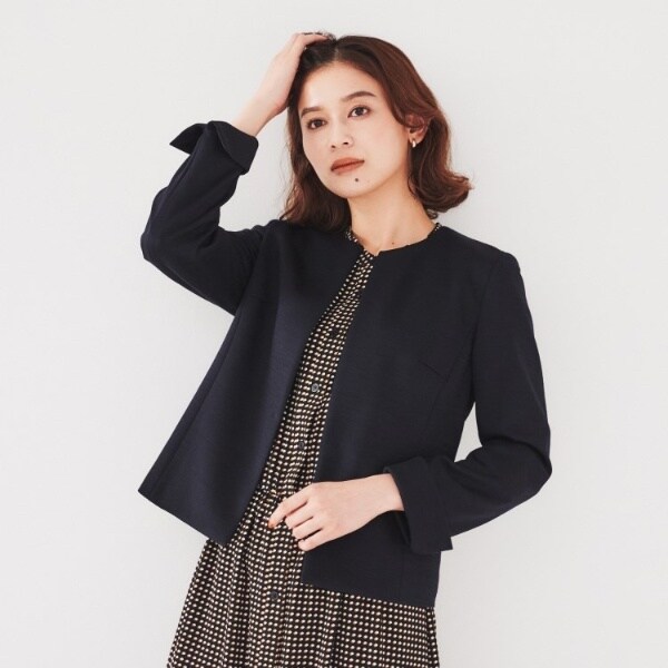 ウエストも程よくシェイプした女性らしいジャケットに仕上げ、袖口は折り返しできるスリットの仕様にしています。