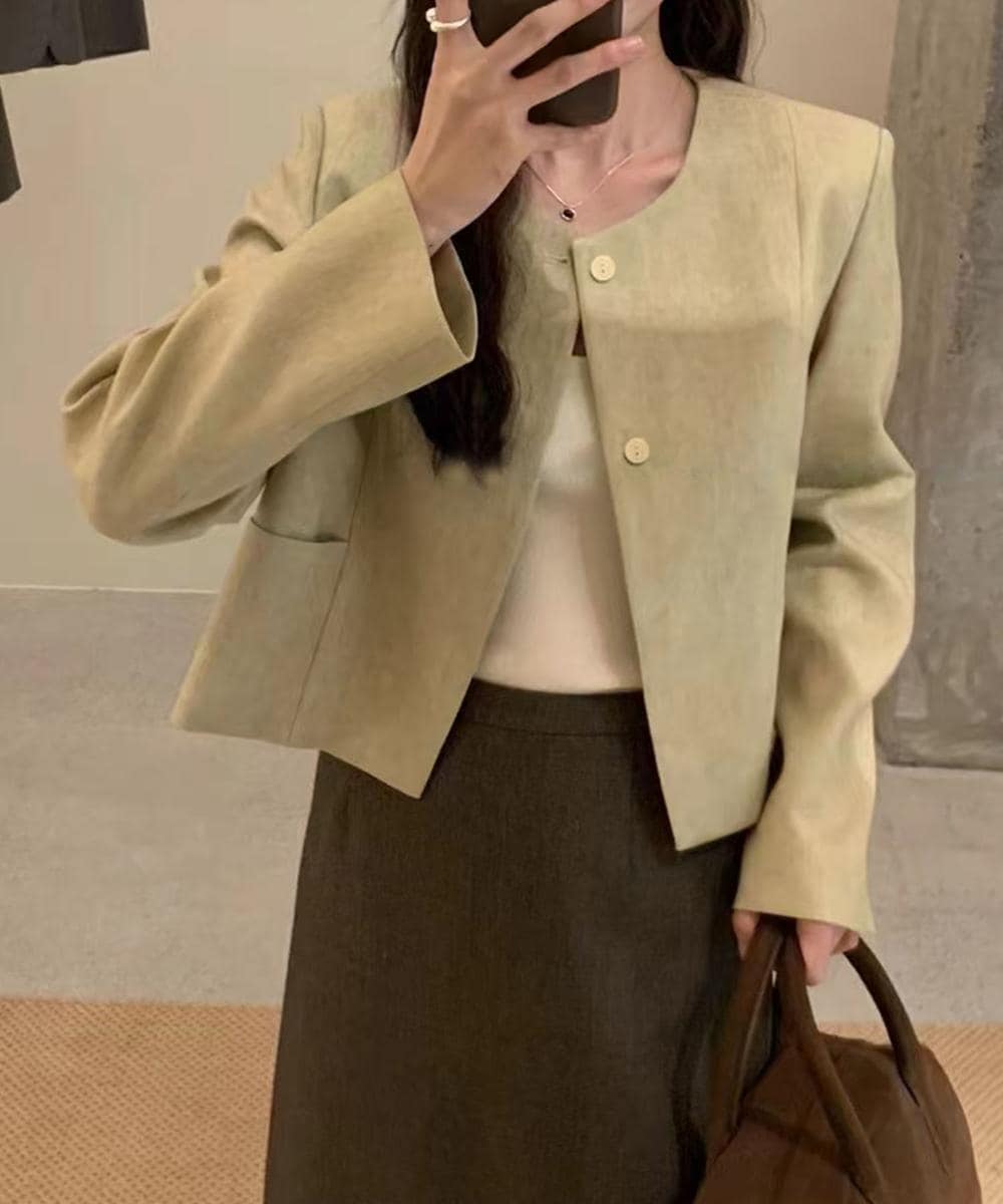 シンプルなボタンデザインが特徴のショートジャケット。スリーブやポケット部分のディテールがアクセントとなり、シンプルながらも存在感のある一着です。カジュアルにもきれいめにも着こなせる万能アイテムで、どんなスタイルにもマッチします。