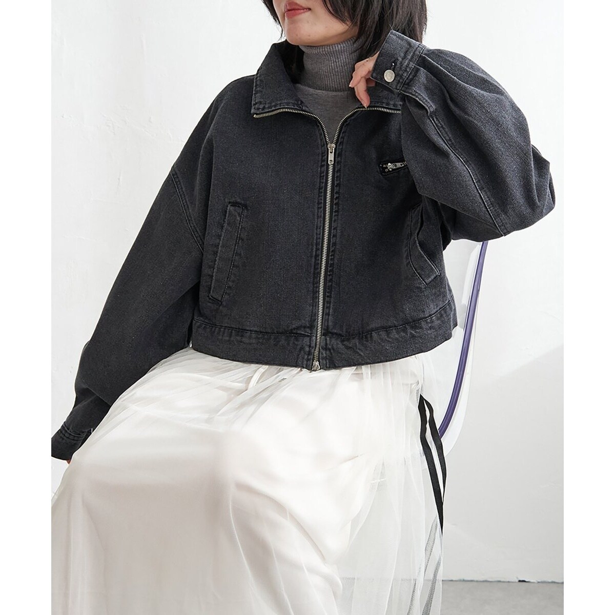 デニム生地のカジュアルスタイルにぴったりなブルゾン。