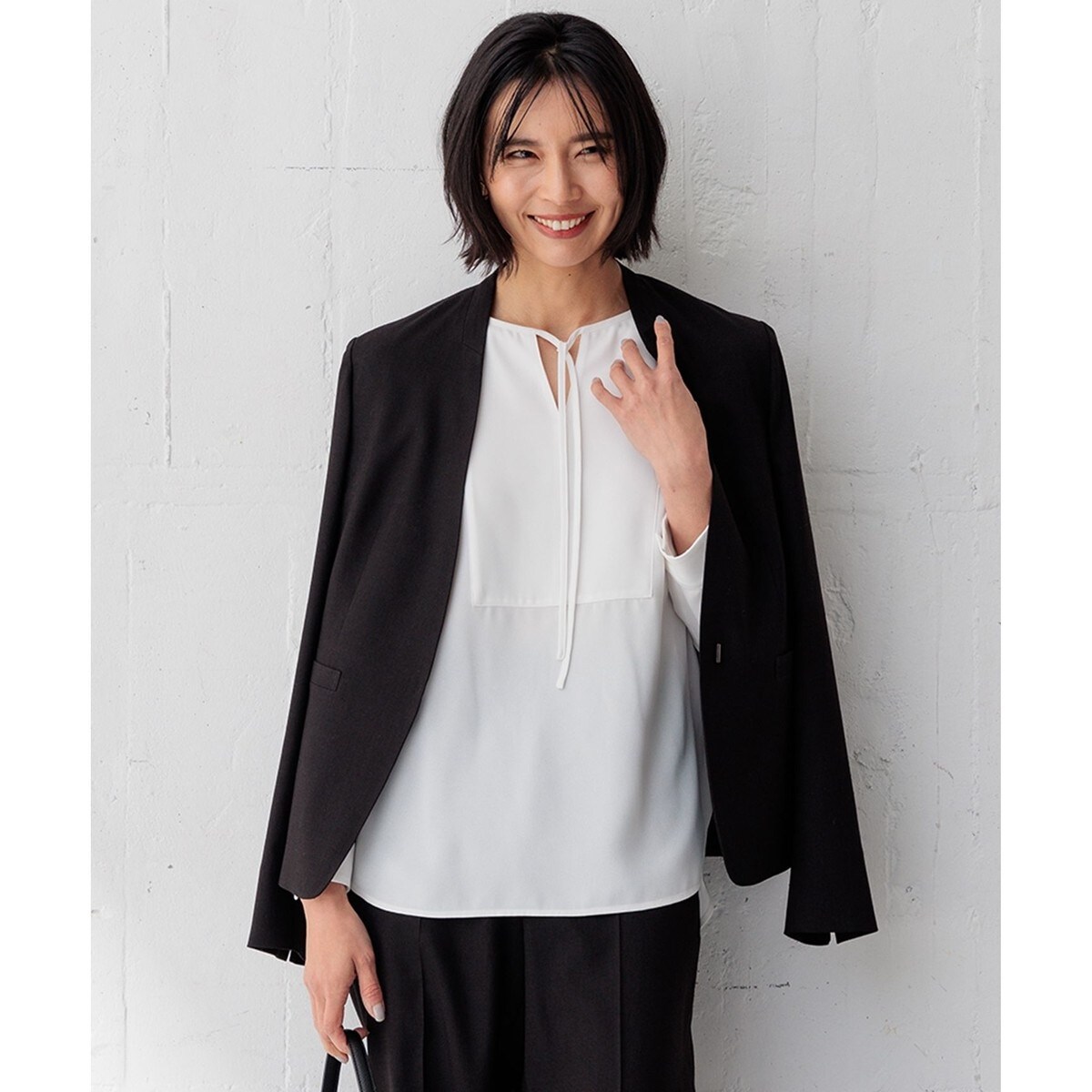通勤やかしこまった場で活躍するノーカラージャケットです。バランスのとりやすい丈感なので、カジュアルなスタイリングにもお召しいただける着回し抜群のジャケットです。同素材のパンツやスカートと合わせてセットアップでの着用もおススメです。素材の軽さもあるので、前を開けて肩にかけてもさらっと着こなしやすいです。カラーは、女性らしく清潔感溢れるベージュ(#033)、大人上品なネイビー(#075)、どんなシーンにもお使いいただけるブラック(#005)の3色展開です。