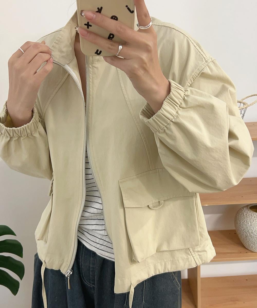 シンプルながらもウエスト部分のギャザーがポイントのショートジャケット。春や秋の季節の変わり目にぴったりの万能アイテムです。