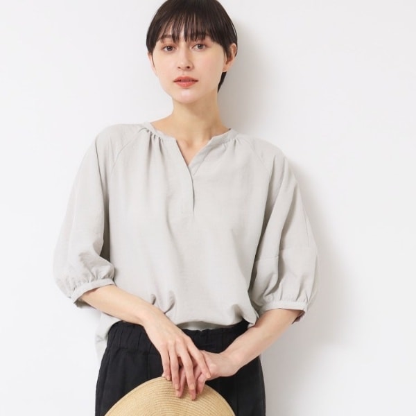 顔周りをすっきりと見せてくれるスキッパー襟にボリュームのある袖がポイントのブラウス。二の腕カバーできる五分袖です。