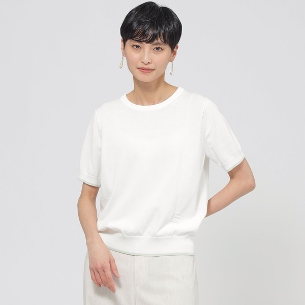 裾端と袖口に入れた細目の配色ラインがポイントの半袖ニットプルオーバー。裾リブ上に畦編みで表現した?E?のロゴマークがアクセントになっています。二の腕が隠れる袖丈が安心感のある一着です。すっきりとしたシルエットはインナーとしても1枚で着ても合わせやすく、幅広いコーディネートで重宝します。