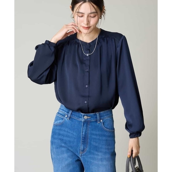グリーンレーベルリラクシング サテン ギャザー スタンド ブラウス