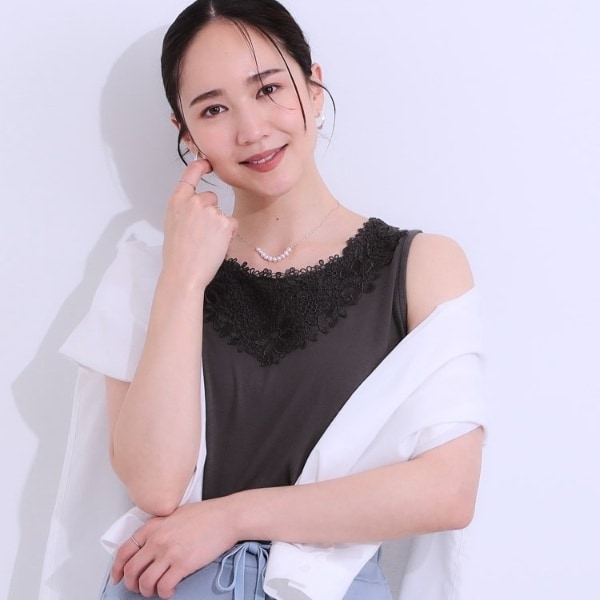 【S-LL】衿レースハイネックリブトップス