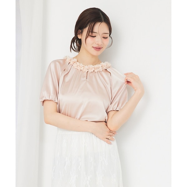襟元には立体的なフラワーモチーフをあしらい、顔まわりを華やかに演出します。