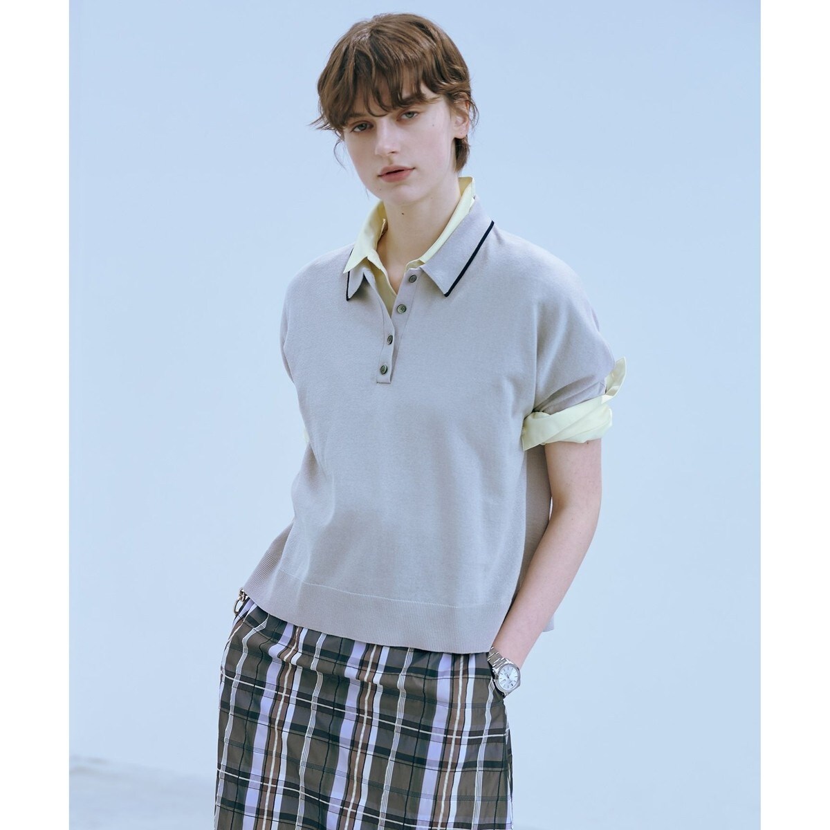 ■デザインゆるすぎないサイジングで程良い抜け感のあるニットポロシャツ。衿端と袖口端に配色ラインを施しアクセントにしました。パンツやスカートと合わせて、オンオフ幅広くお使い頂けるアイテムです。カジュアル過ぎない一枚で、品よく爽やかな春スタイリングが叶います。