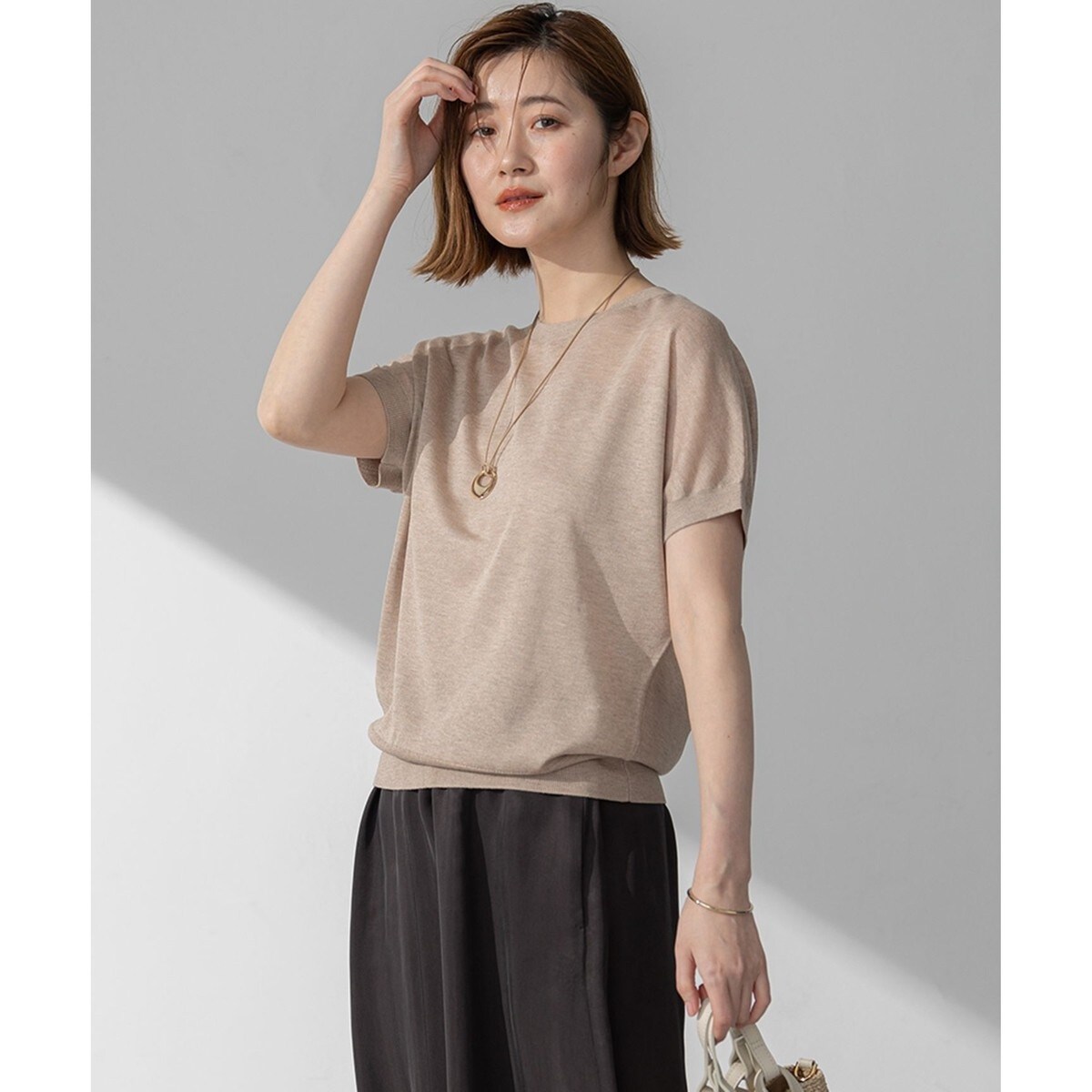 シンプルなドルマンデザインのニット。シアーな編地切り替えを入れて華やいだイメージにブラッシュアップしました。気になるボディのラインはカバーしつつ、着心地抜群なイージーニットです。ワイドパンツと合わせればマニッシュに、スカートと合わせればフェミニンに、程よい存在感でスタイリングが決まる万能アイテム。 カラーは、抜け感のあるアイボリー(#003)、ベーシックなブラック(#005)、やわらかなベージュ(#033)、こなれ感のあるダークブラウン(#035)、爽やかなスカイブルー(#072)の5色展開です。