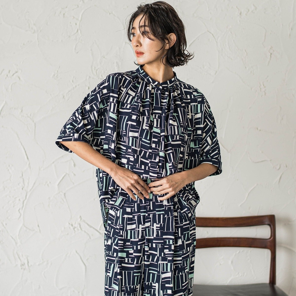 トップス ポリエステル素材 / 幾何学柄 / 半袖 / 5分・7分袖 / ストレートショルダー / LL・13号以上あり / 洗える / ライフスタイル / スタンドカラー / その他衿ぐり / パーティー・結婚式・二次会 / セレモニー・入学式・卒業式 / レギュラー丈(トップス)
