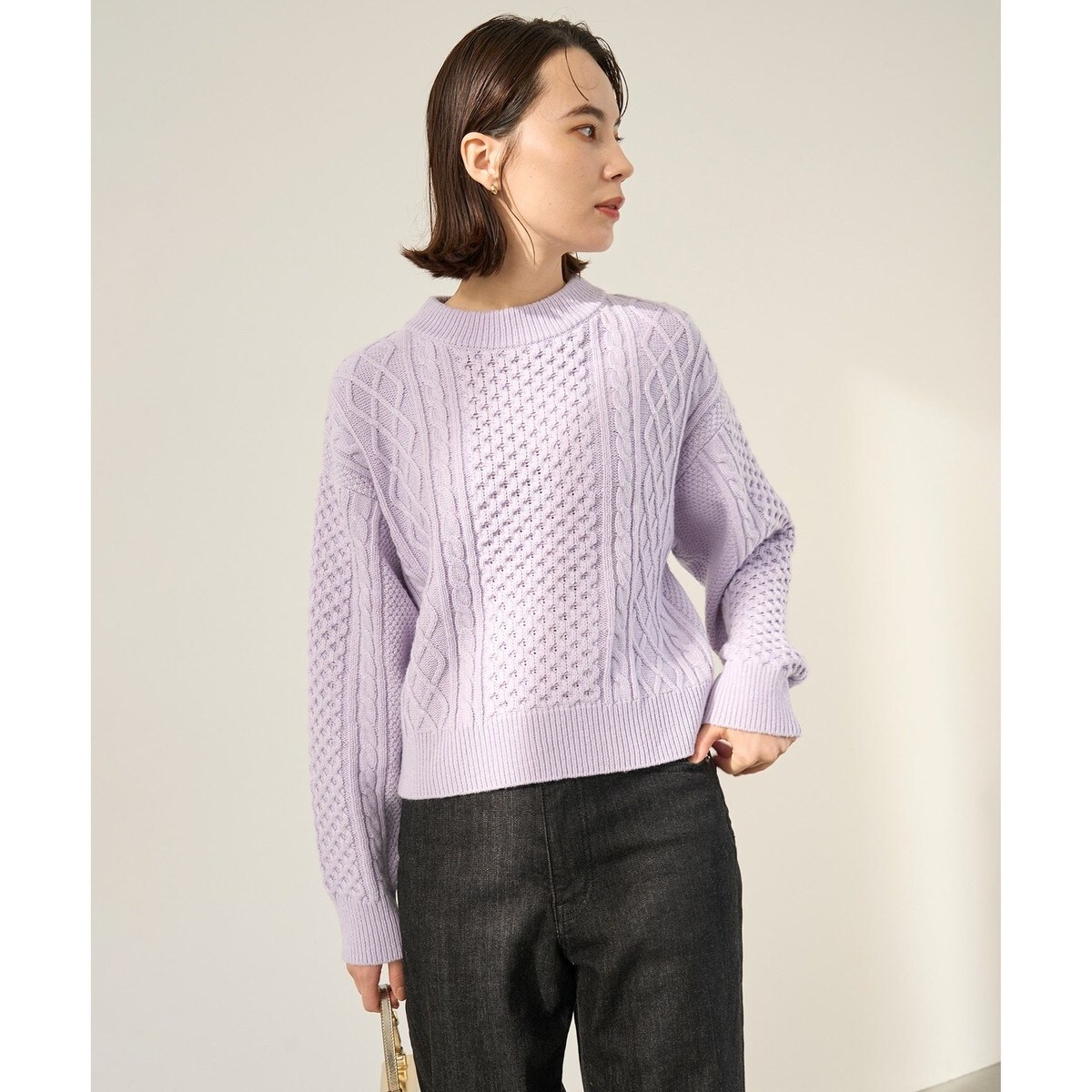 ■デザインアラン柄の編み目がクラシックな印象のプルオーバー。首回りに余裕を持たせたモックネックデザイン、クロップド丈のワイドシルエットにすることで今年らしいシルエットにしています。どんなボトムとも合わせやすく、レイヤードインナー合せもおススメ。