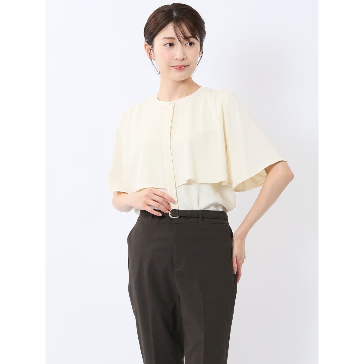 ケープをまとっているように見える、半袖の前開きブラウスです。すっきりとしたバンドカラー、ドレープ感のある前後のケープ、二の腕をカバーするフレアスリーブ、ボタンの隠れる比翼仕様がポイント。キチンと感のあるクリーンなルックスなのでオンオフ兼用で大活躍してくれます。