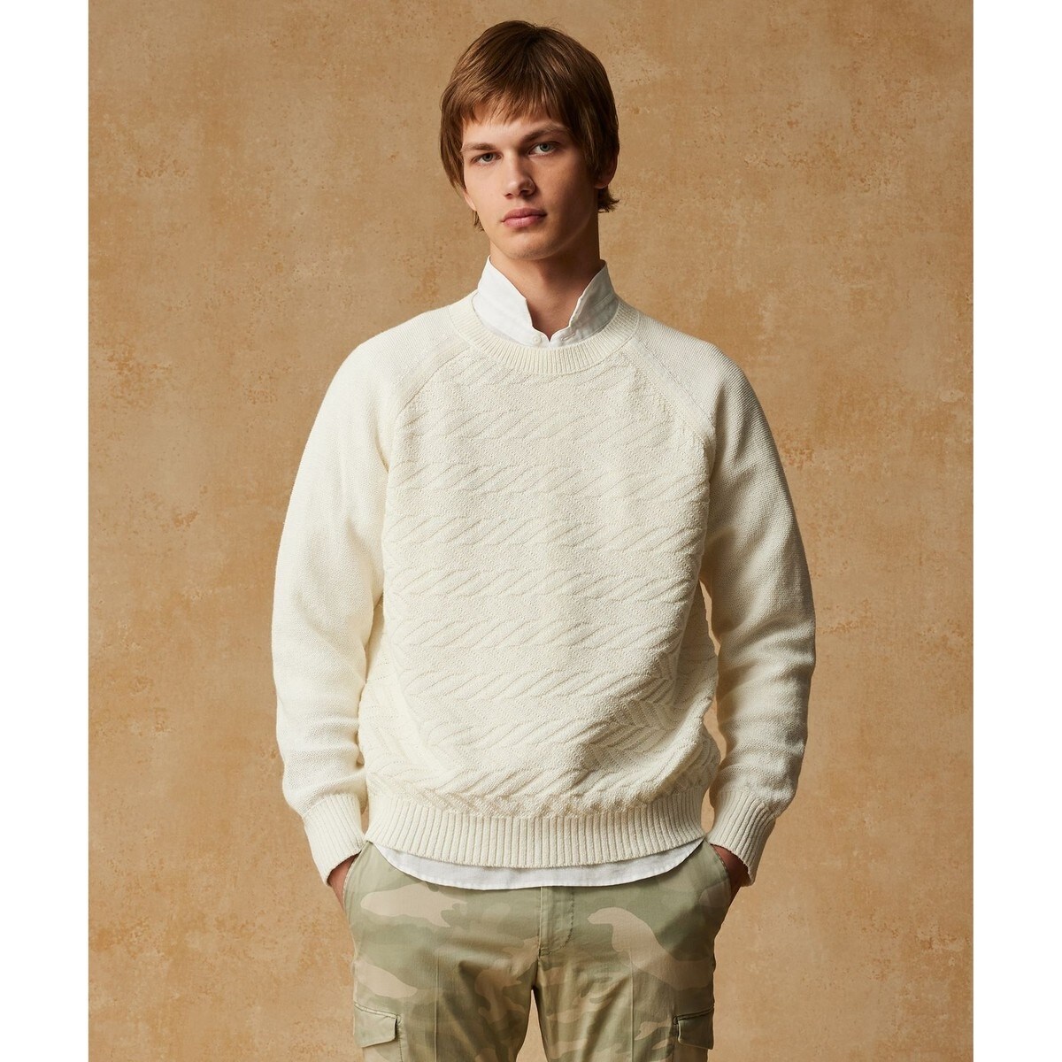 ■デザイン前身頃はヘリンボーン柄をリンクス編みで立体的に表現。後身頃と袖は天竺編みですっきりと仕上げたラグランスリーブのクルーネックセーターです。
