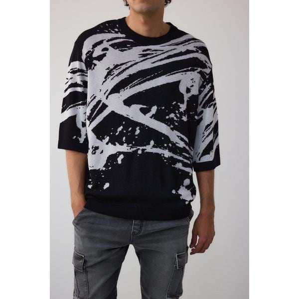 ■アブストラクトジャガード5分袖ニット■ポイント幾何学柄がお洒落な5分袖ニットです。■ディティール1サイズでややゆったりシルエットになります。5分袖なので寒い時期はインナーとして、暖かくなったら1枚着として、幅広くお使い頂けます。■スタイリングスキニーデニム合わせでカジュアルに着ていただくのがおすすめです。■生地強撚のレーヨンを使用した素材でドライ感を表現しました。特に、ホワイトボディにブラック柄の色を重ねて編んでいるため、強配色により、ホワイト地のブラックの透けが目立ちます。ダブルジャガードの生産工程の特徴で、避けられませんので、ご了承ください。透け感:なし裏 地:なし伸縮性:なし光沢感:ややあり[注意事項]※画像の商品はサンプルです。実際の商品と仕様、加工が若干異なる場合があります。※画像の商品は光の照射や角度、お使いのモニター環境により、実物と色味が異なる場合がございます。※着用、お取り扱いの際は、アテンションタグをご確認ください。