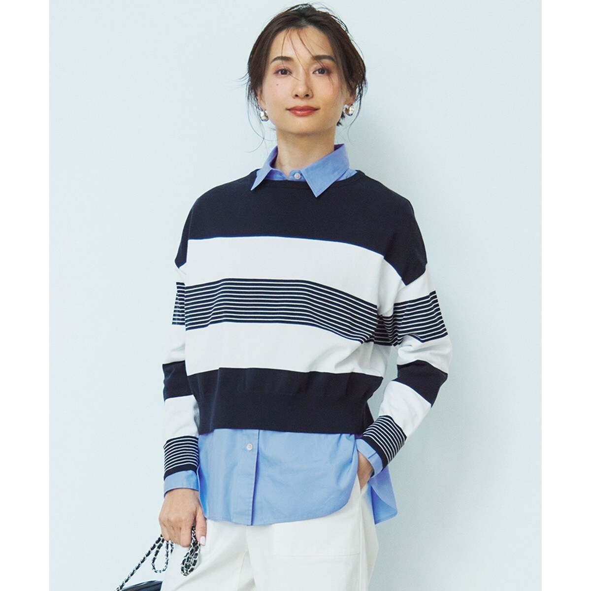 天竺編みの長袖ショート丈のニット。身頃はオフボディでゆったりとしたシルエットに仕上げました。襟もとはボートネックで、肌寒い時季はブラウスやカットソーとレイヤードしたり、春先には一枚着として着用でき、長いシーズン活躍します。ワイドパンツと合わせると抜け感がプラスされ、タイトなボトムやスカートと合わせるときれいめな雰囲気を楽しめます。カラーはボーダーのみの展開で、やわらかな雰囲気のベージュ×オフ(#133)、洒落感のあるセージ×オフ(#162)、上品な印象のネイビー×オフ(#175)の3色展開です。