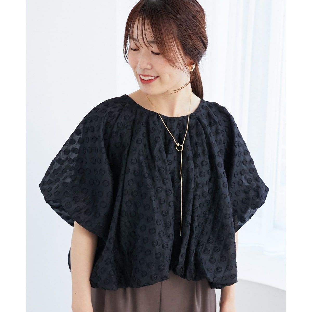 オーガンジー水玉ジャガード生地を使用しバルーンブラウスを作りました。