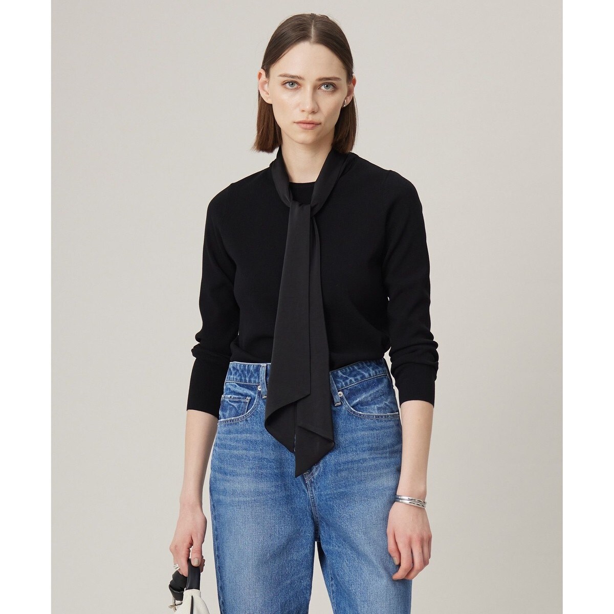 ■デザインしなやかで微光沢なポリエステルサテン地のボウタイを纏った優美な印象のデザインニット。ボウタイは長めに設定しているので、あえて結ばず後側に垂らしていただくスタイリングもおすすめです。ボディーは総針編みで直線的シルエットに仕立て、ボウタイはクルーネックの後ろ衿の釦で取り外し可能な仕様に仕上げました。ボウタイを取り外してクルーネックプルオーバーとしても着用でき、幅広いシーンでお使いいただけます。