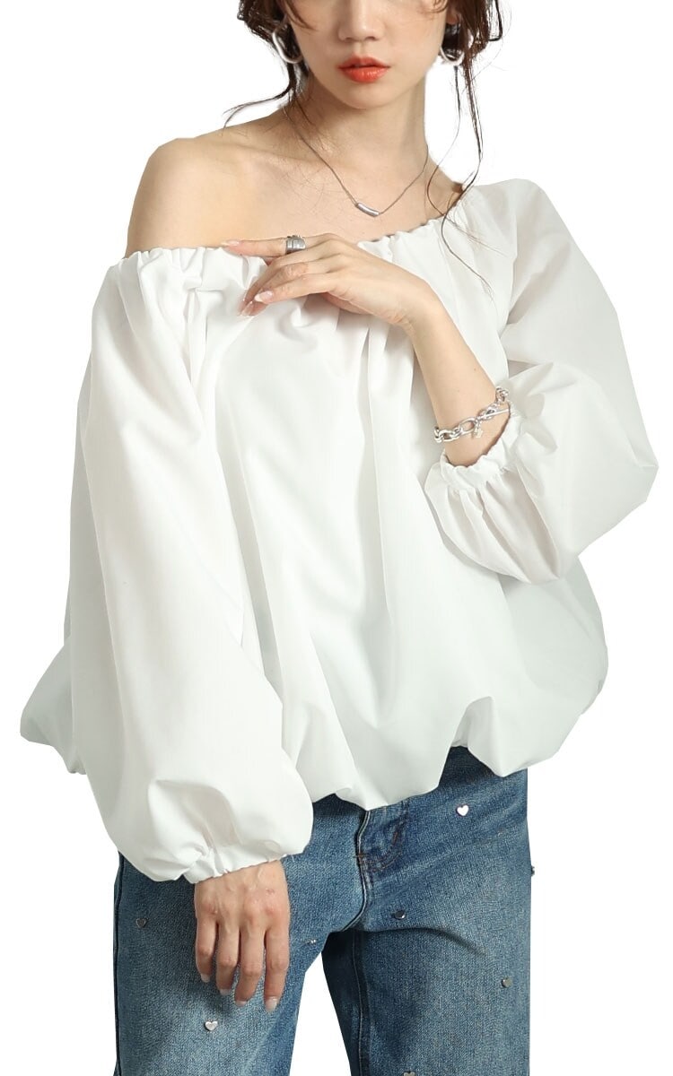 ふんわりレディに包まれるブロードオフショルバルーンブラウス。ぽわんと丸みのあるバルーンシルエットがかわいらしいデザイン。オフショルにもワンショルにもアレンジを変えて楽しめます。丸みのあるフォルムは肩周りを華奢に見せてくれます。シンプルなので着まわしやすくレディに着こなせる1枚です。