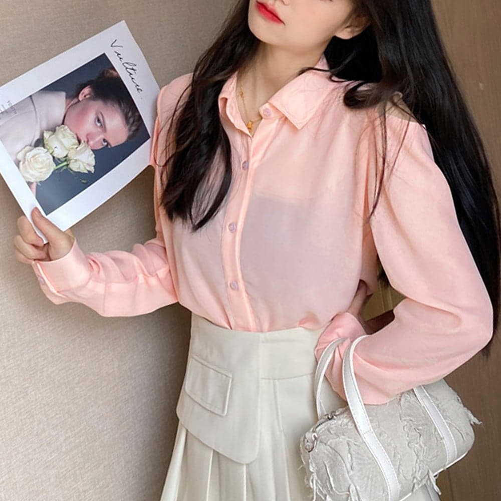 程よい肩出しスタイルが可愛くセクシーな長袖シャツブラウス