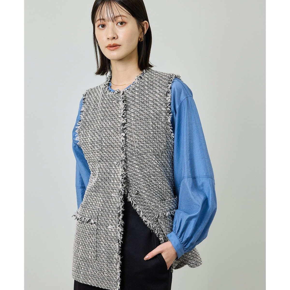ツイード素材のノーカラーのジレ。フリンジディテールが華やかで、きれいめにもカジュアルにも使えるアイテムになります。さりげないくるみ釦で普段使いにもしやすいディテールに。