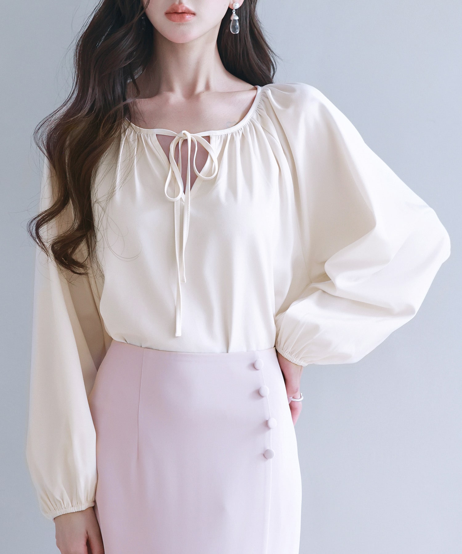 胸元のリボンを結んでも垂らしてもOK。結ぶとギャザーが寄せられて立体感を演出し、垂らすとよりラフなスタイルに。