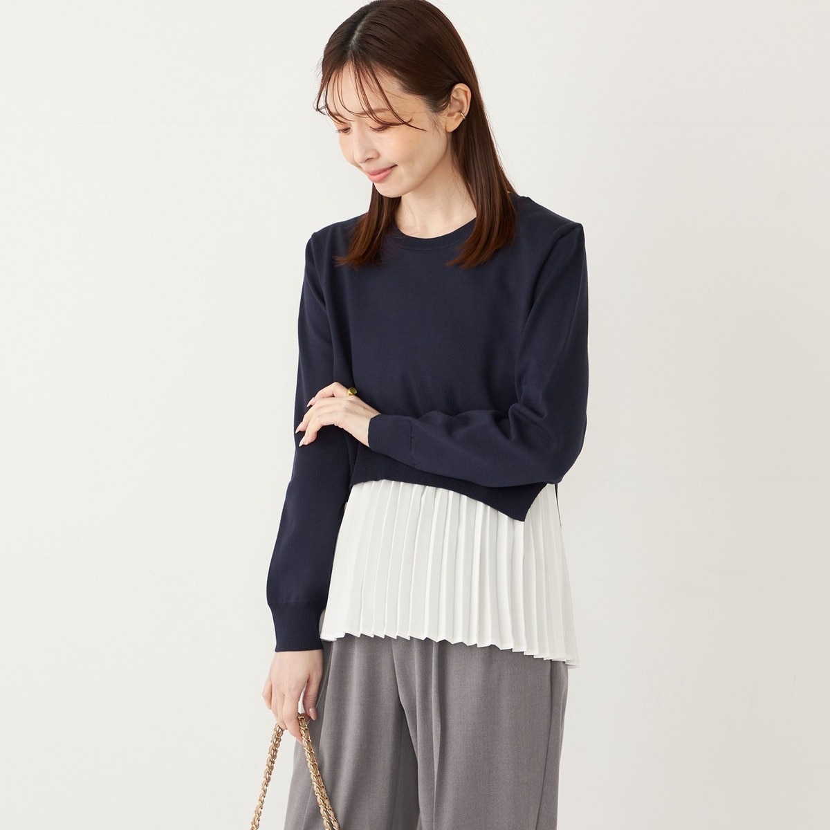 ニットトップスの裾にプリーツをドッキングさせた着映えトップス。