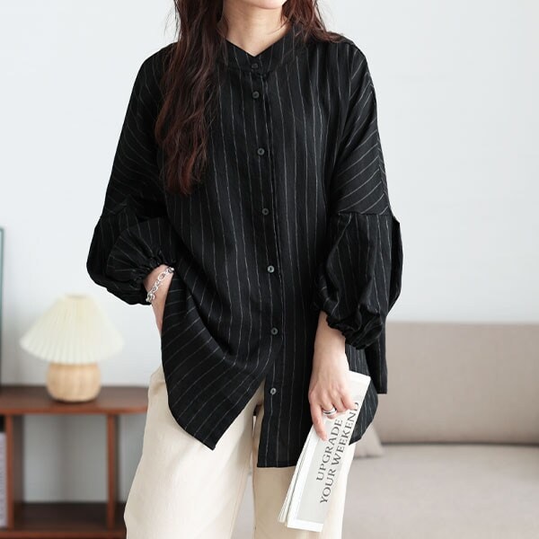 お洒落に着回せるピンストライプ柄ブラウス。ボタンを留めて、そのまま羽織って、その日の気分で着こなし広がる!ゆったりと着られるリラクシーなシルエットは身体のラインを拾わず体型カバー効果◎ふんわりバルーン袖が手元をお洒落に演出します。麻混のナチュラルな風合いでサラッと軽やかに着こなすことができ、春~秋にかけてロングシーズン活躍してくれる一着です。