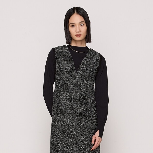 ウエストを絞り、裾に向かって広がるシルエットと深めのVネックのラインをあえてカーブにすることで、女性らしさを際立たせたツイードジレです。