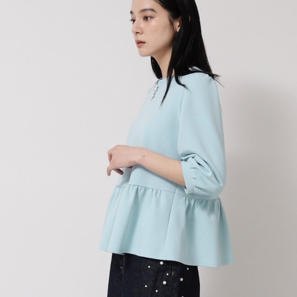 フロントのスリット部分にパール調パーツを施したペプラムプルオーバー。