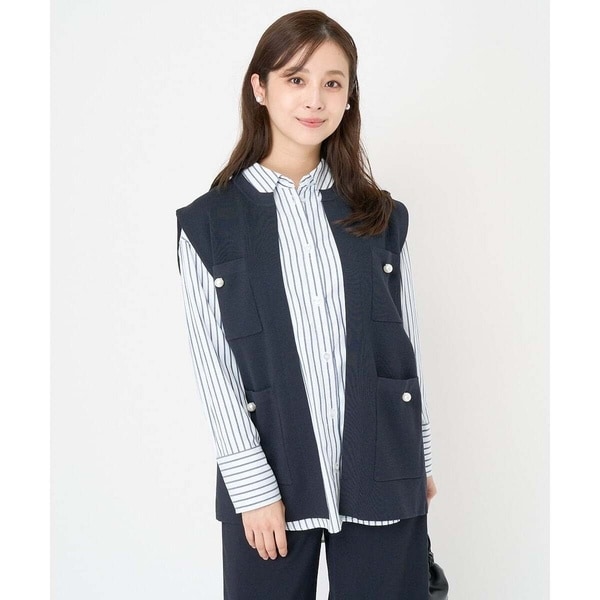 きれいめな印象で着こなしたいニットジレ。ジャケットライクなデザインで、コーデにプラスするとクラシックな装いが完成します。パール調釦もデザインポイントに。