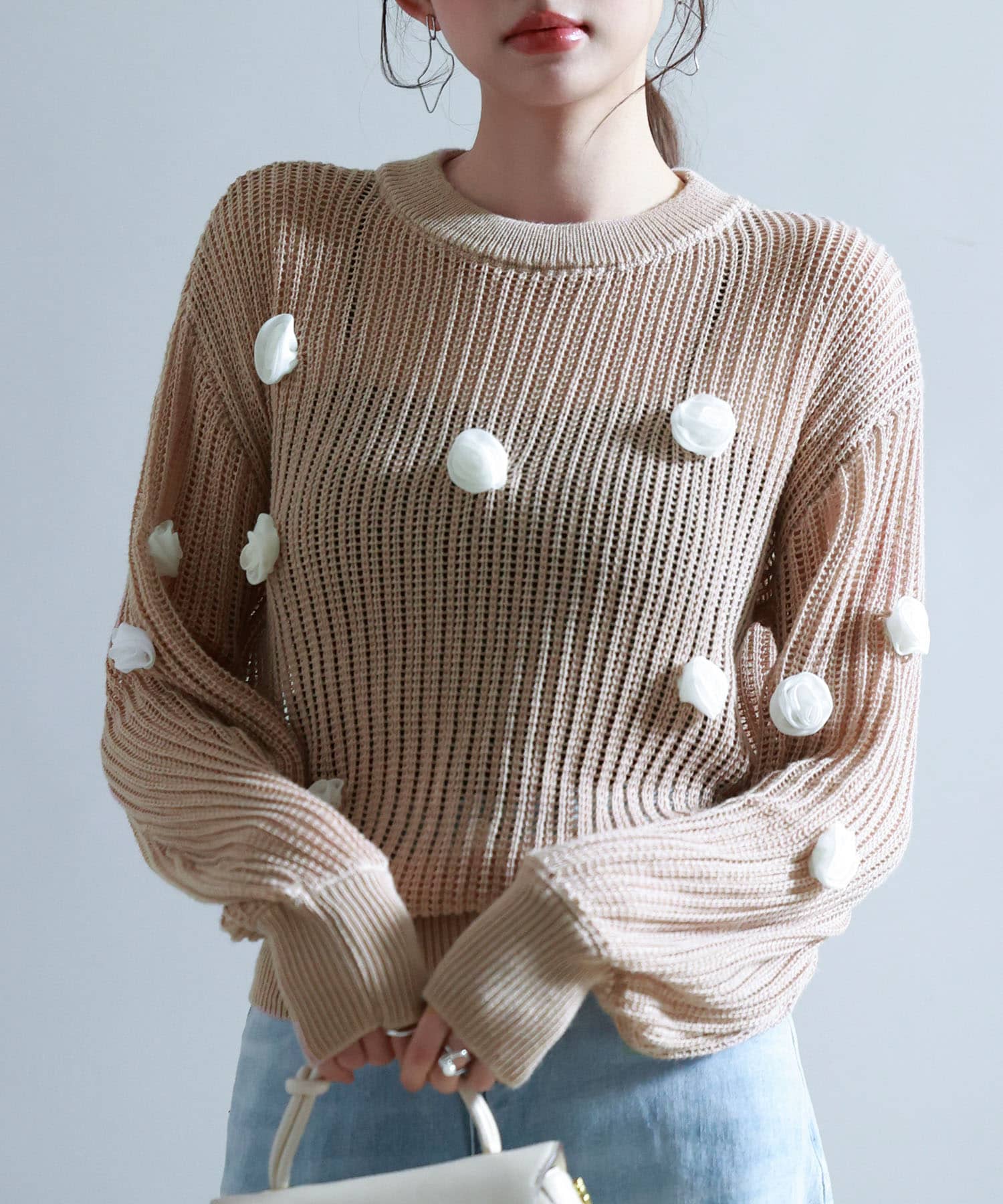 透かし編みでシアー感のある無地のリブニットにランダムにあしらわれたバラの立体モチーフが印象的な一枚。