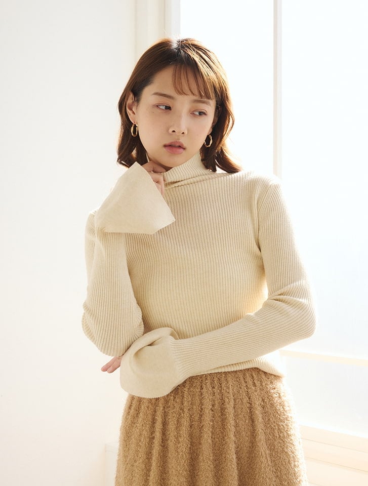 フレア袖が女性らしい印象のハイネックリブプルオーバー